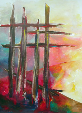 Wie martialisch klingt dieses ständige Rufen „Kreuzige ihn, kreuzige ihn ...“. Auch dieses Rufen nach Strafen und Vergeltung sind wohlbekannt und treffen uns Menschen individuell und kollektiv. Auch wir können die Rufer, aber auch die Verfolgten werden. Im Bild stehen vier Senkrechte, drei Waagerechte kreuzen die Senkrechten. Die vierte mögliche Waagerechte liegt als Diagonale am Boden. Sobald einer von uns Betrachtern des Bildes nach der vierten Waagerechten fragt, nimmt er mit der Antwort, dass sie ja als Diagonale am Boden liegt, sozusagen sein Kreuz auf sich. Links im Bild ist es dunkel, nach rechts öffnet sich die Dunkelheit ins feurige und helle Licht. „Tut Buße, denn das Himmelreich ist nahe herbeigekommen!“ (Mt 3, 2) |
